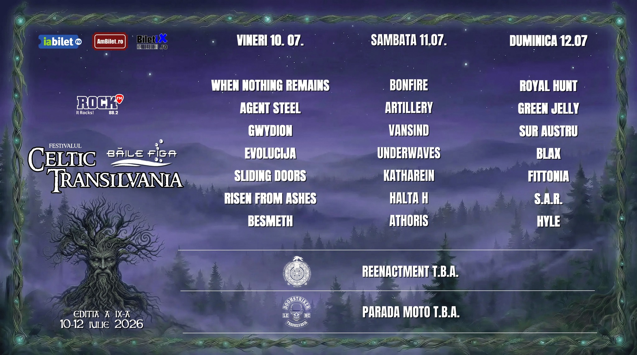 🔹 Festivalul Celtic Transilvania, ediția a VII-a, va avea loc în perioada 10 - 12 Iulie 2026, în localitatea Beclean, zona Băile Figa. Organizatorul își rezervă dreptul de a modifica locul de derulare a evenimentelor. În cazul unor astfel de modificări, biletele achiziționate vor rămâne valabile pentru noul loc de derulare a evenimentului.